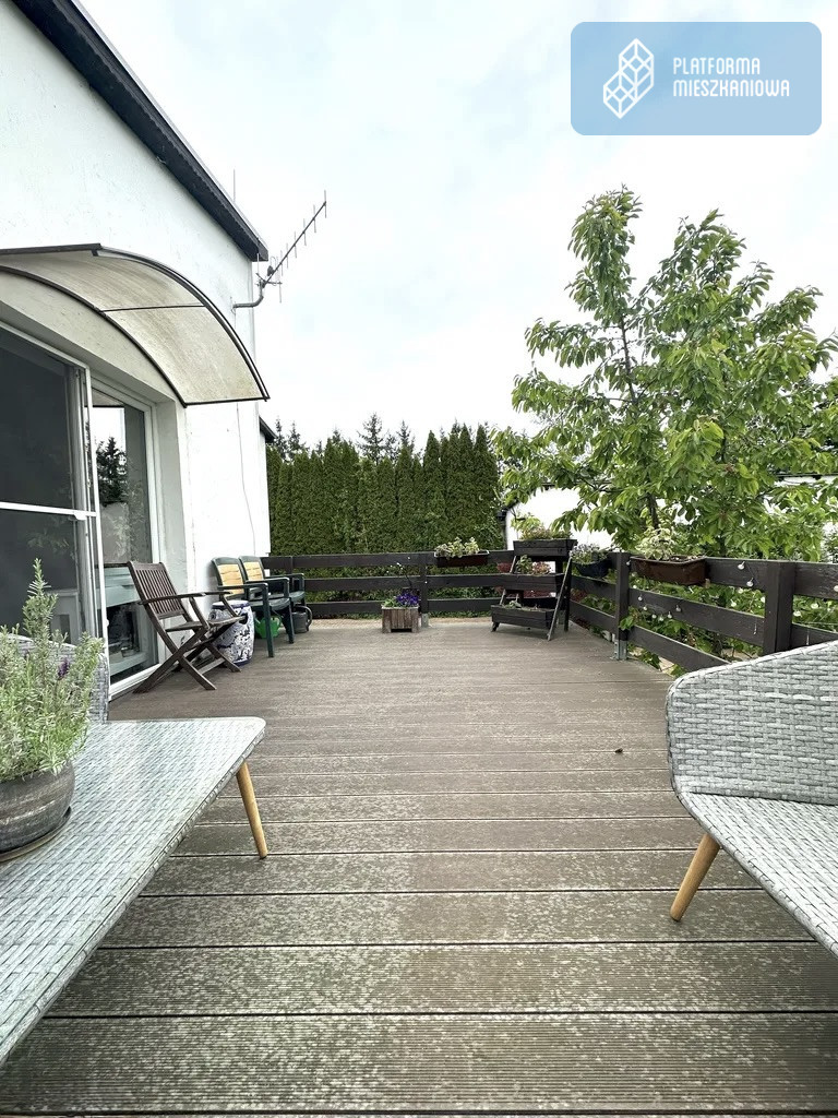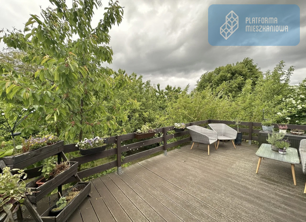 Z jadalni wyjście na duży balkon, z którego mamy widok na zieleń ogrodu. W ogrodzie znajdują się liczne drzewa oraz krzewy, nadające wyjątkowego klimatu całemu domu.