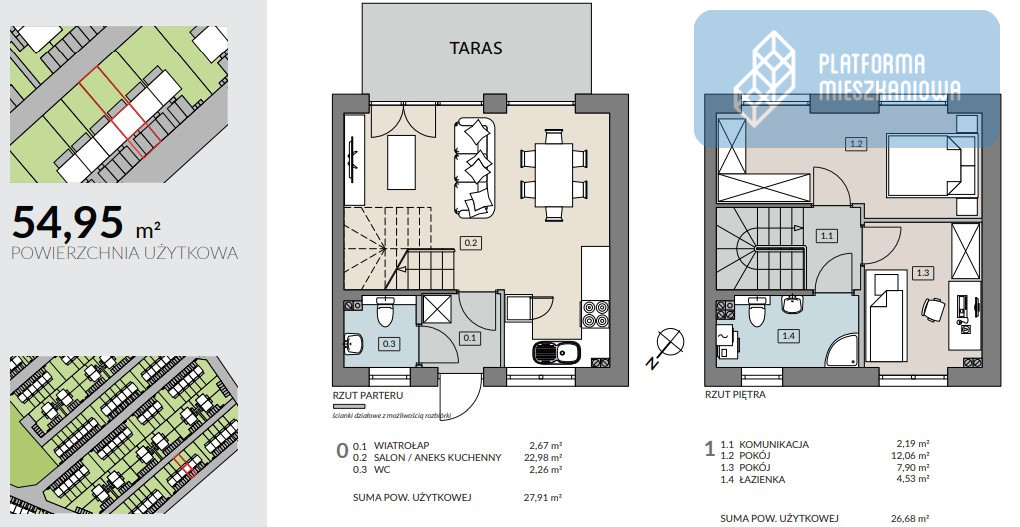 54,59 metrów kwadratowych powierzchni użytkowej w skład której wchodzą dwa poziomy (parter oraz piętro)