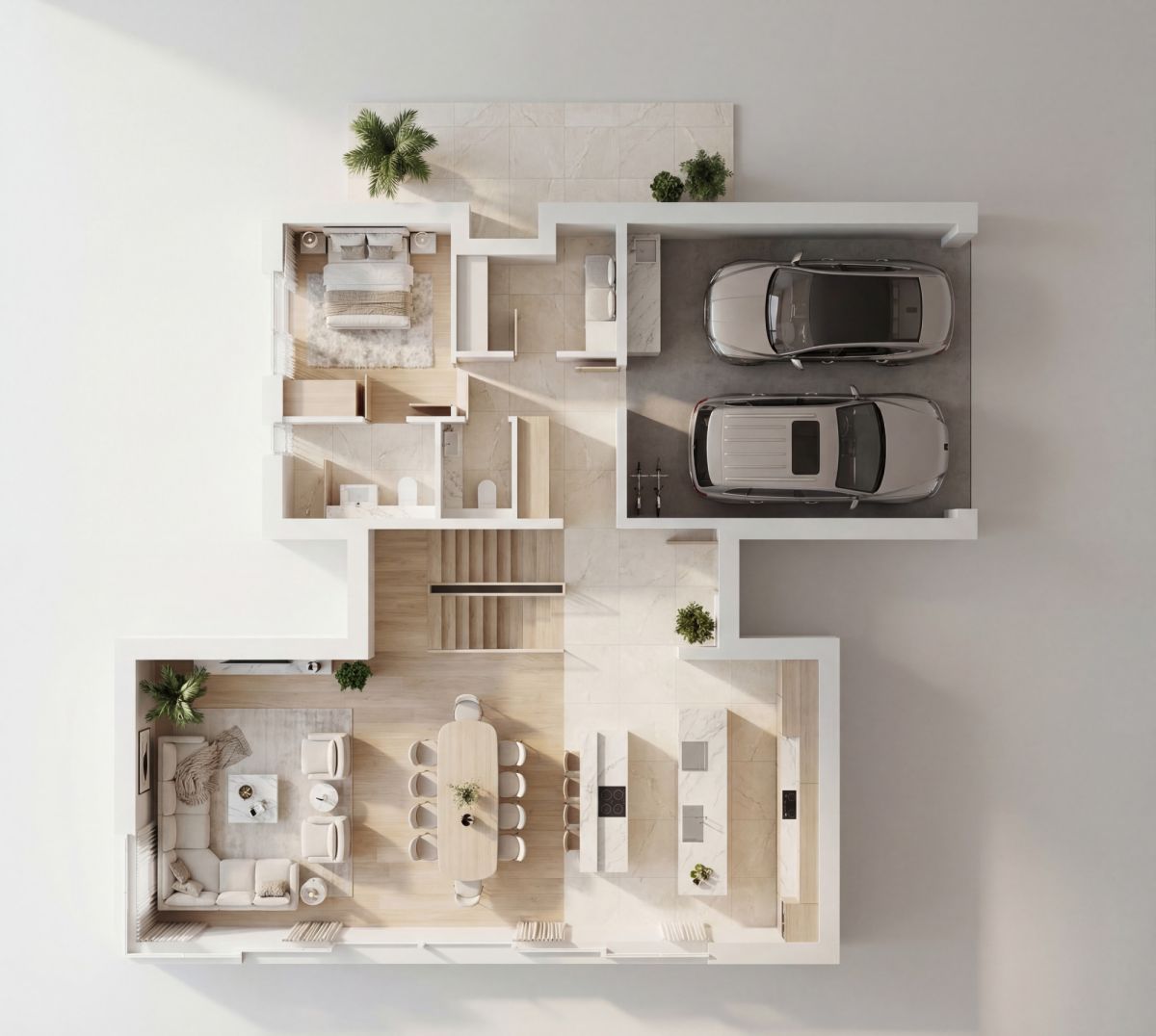 Układ domu obejmuje pięć pokoi, dwie łazienki oraz dodatkową toaletę. Każda z sypialni na piętrze posiada własną garderobę, a garaż na dwa samochody został wkomponowany w bryłę budynku.