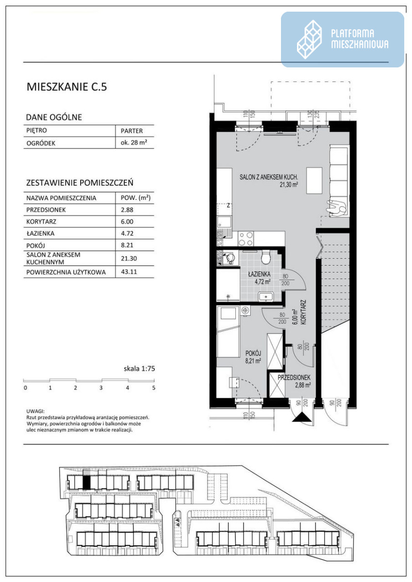 2-pokojowe mieszkanie o powierzchni 43,11 m², zlokalizowane na parterze. Mieszkanie posiada prywatny ogródek o powierzchni ok. 28 m²