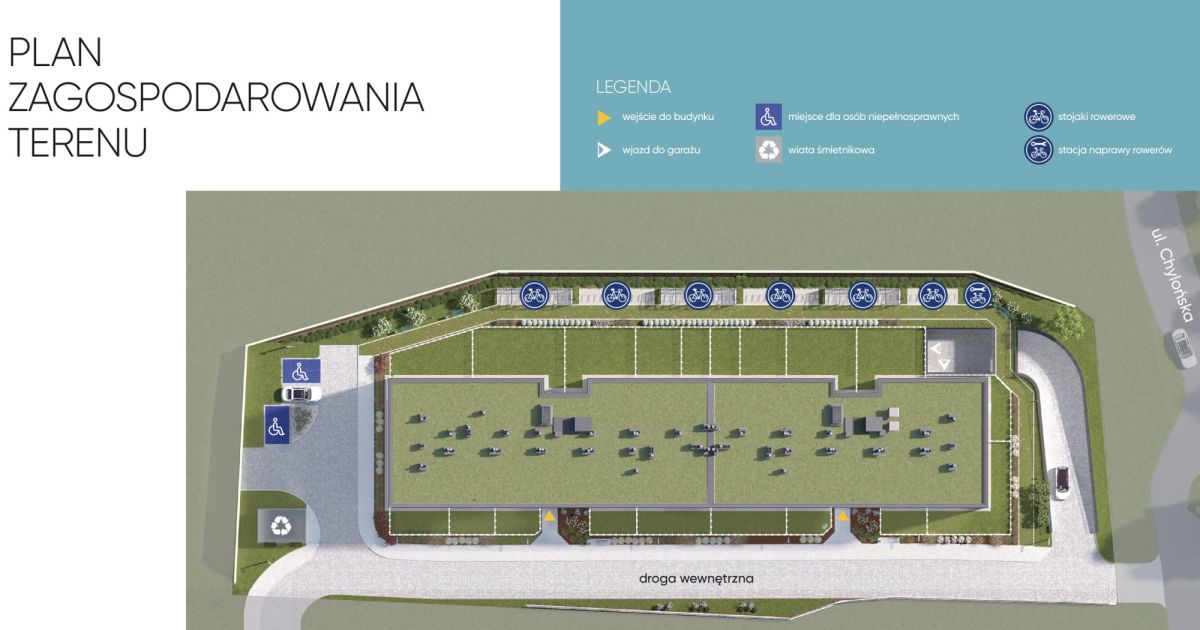 - stojaki rowerowe ze stacją naprawy, stacja ładowania aut elektrycznych, paczkomat, monitoring i garaż podziemny
