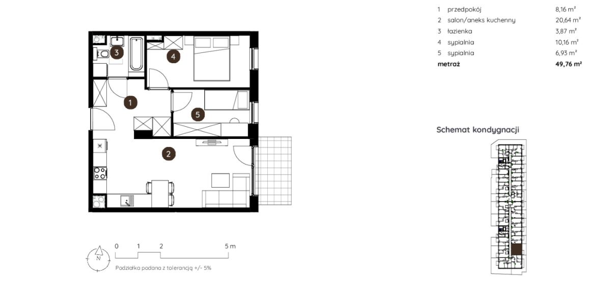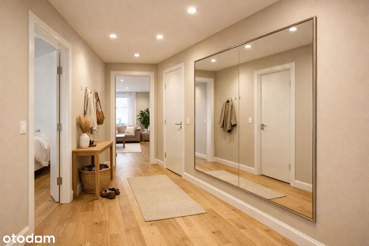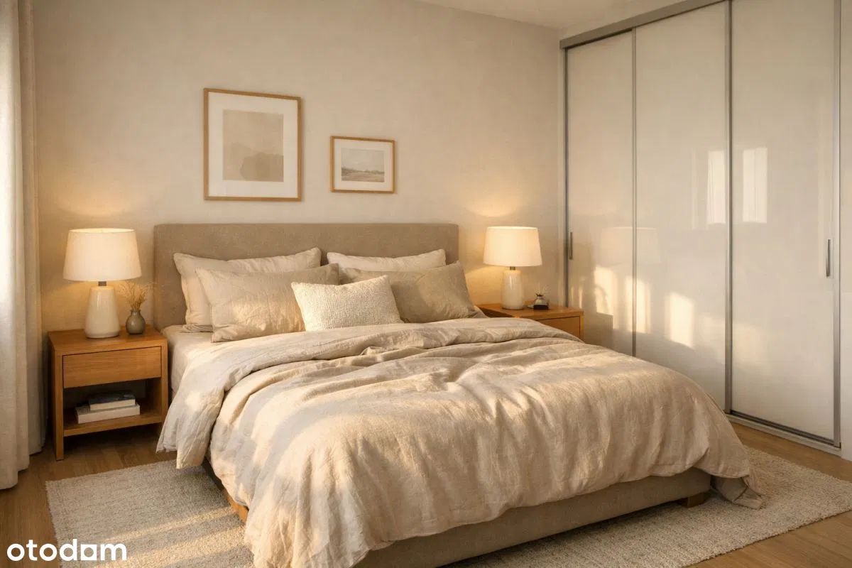 Mieszkanie składa się z salonu z aneksem kuchennym, dwóch oddzielnych sypialni oraz łazienki, co zapewnia komfort zarówno dla pary, jak i rodziny lub osób pracujących zdalnie.