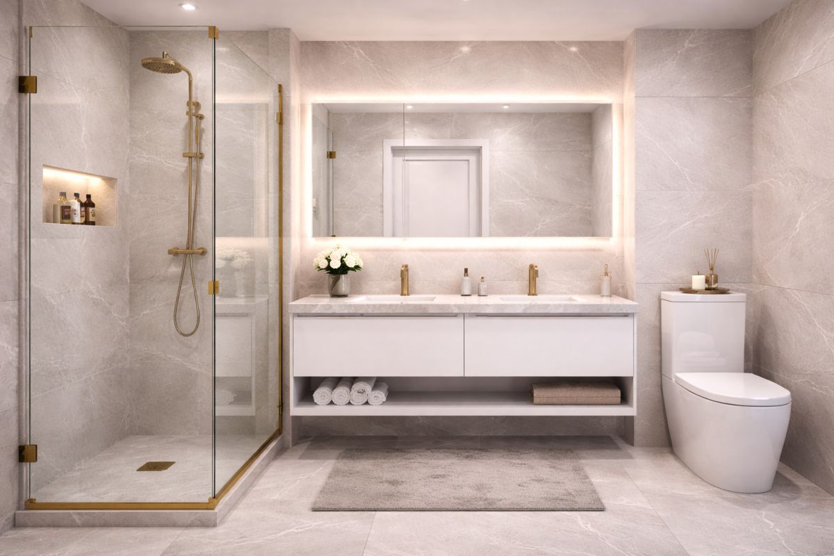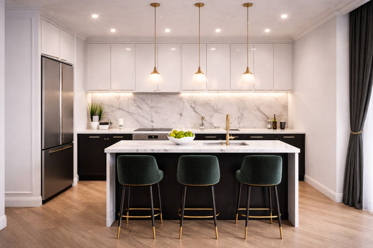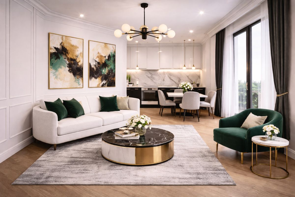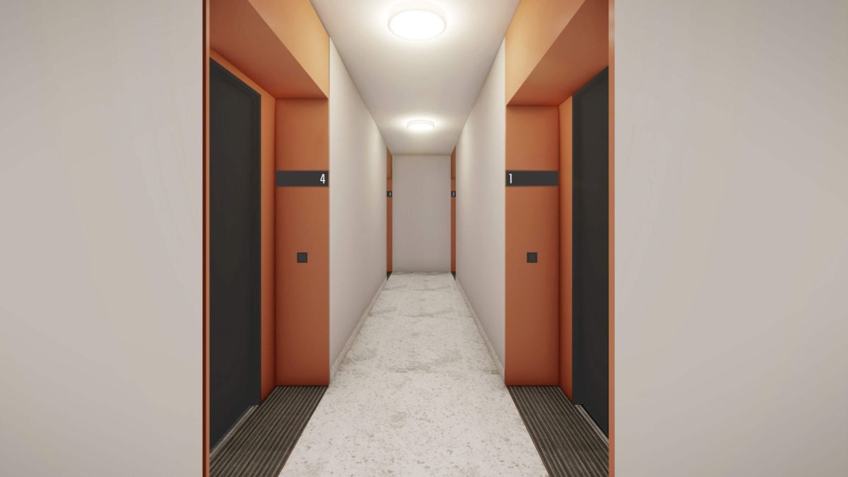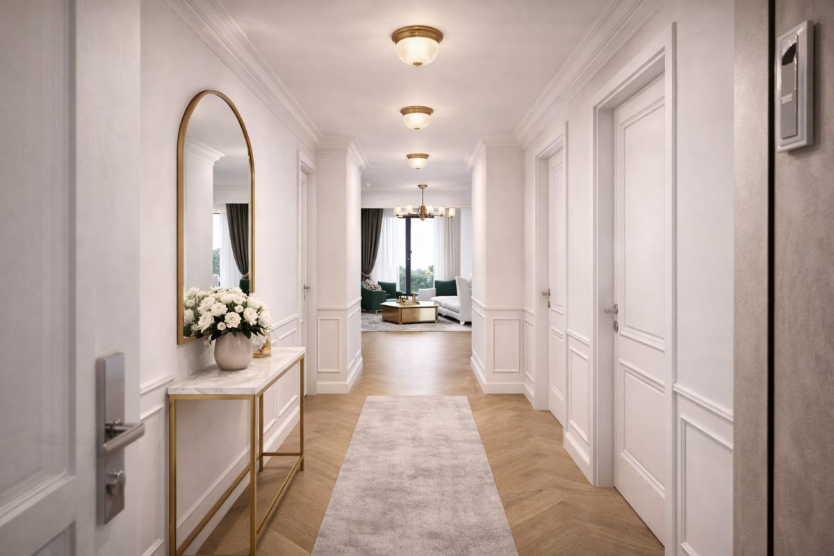 Apartament oferuje harmonijne połączenie elegancji i funkcjonalności: trzy komfortowe pokoje, łazienkę, osobne WC oraz pralnię. Duże przeszklenia zapewniają naturalne światło i poczucie przestrzeni przez cały dzień.