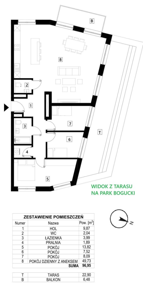 Blisko 97 m² perfekcyjnie zaprojektowanej przestrzeni z imponującą strefą dzienną (ok. 50 m²) oraz wyjściem na duży taras (22,9 m²) z widokiem na park - prywatną oazę ciszy w centrum miasta.