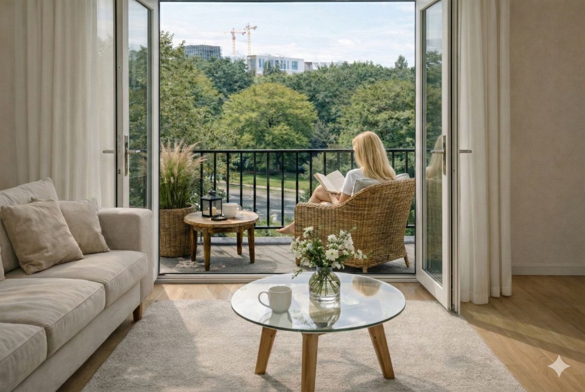 Duże przeszklenia zapewniają świetne doświetlenie, a balkon ok. 6,5 m² to duży atut - zarówno dla komfortu, jak i ceny najmu.