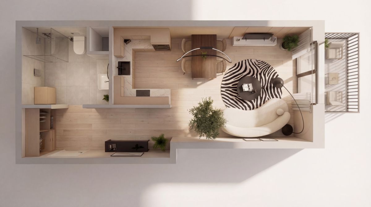 Kawalerka o powierzchni 30,82 m2 z przestronnym pokojem z aneksem kuchennym oraz balkonem, położona na 3. piętrze nowoczesnego budynku w Podgórzu, w rejonie Wisły i Zabłocia.