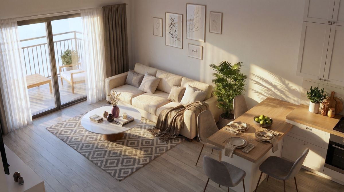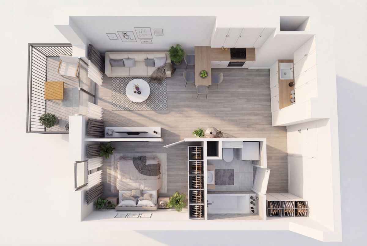 Dzięki przemyślanemu układowi na niewielkim metrażu powstała oddzielna sypialnia oraz przestronny salon z aneksem kuchennym, co zapewnia komfortowe użytkowanie mieszkania zarówno dla singla, pary, jak i inwestora.