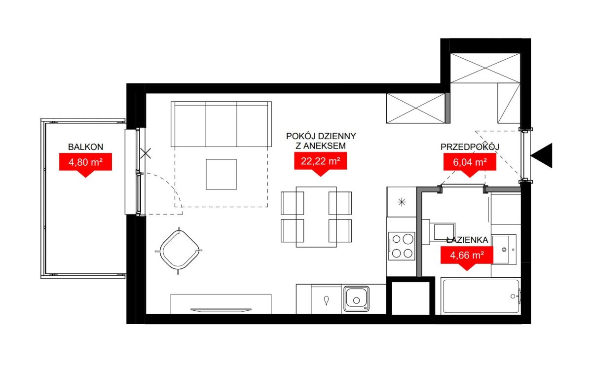 • przestronny pokój dzienny z aneksem kuchennym o pow. ok 28,5 m2,
