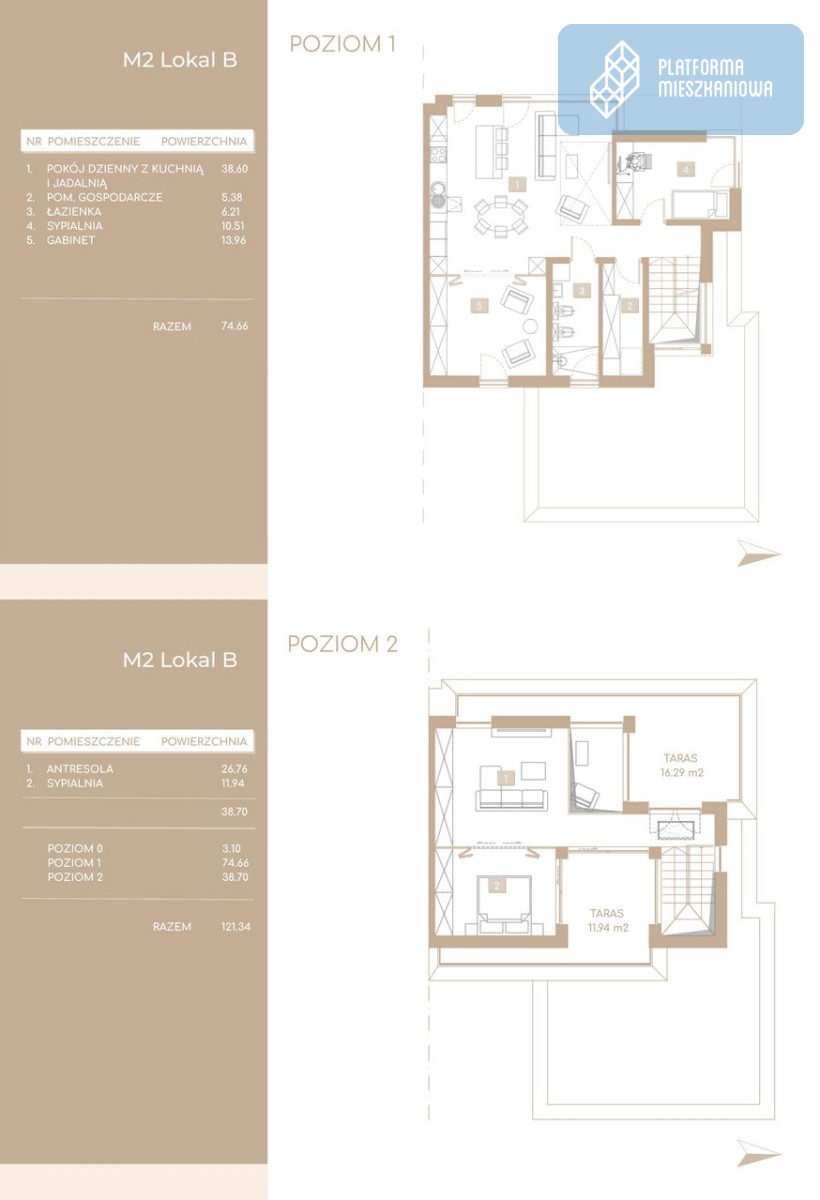 Apartament dwupoziomowy o powierzchni 121,34 m2 został zaprojektowany z myślą o maksymalnym wykorzystaniu przestrzeni: