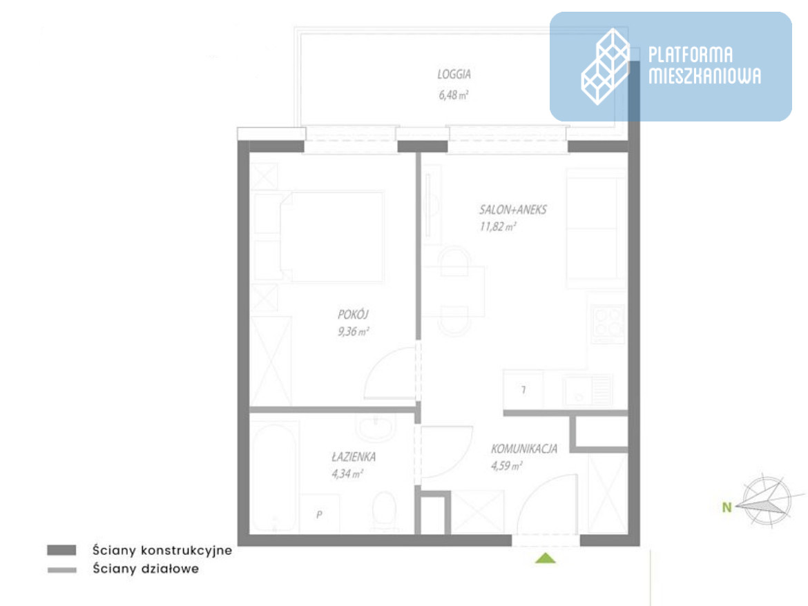 - Salon z aneksem kuchennym (18,57 m²): Jasna i ustawna strefa dzienna z bezpośrednim wyjściem na loggię.