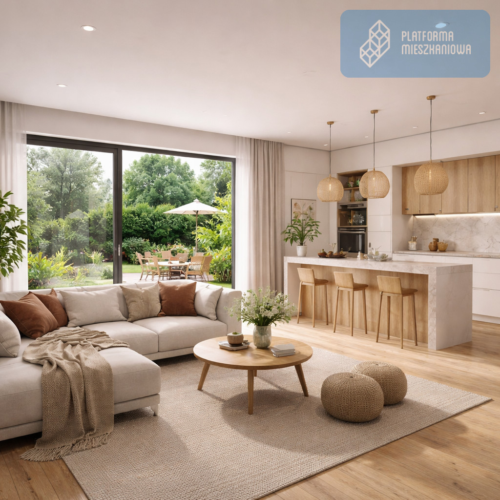 - Salon z aneksem kuchennym: 26,30 m² - serce domu z wyjściem na taras i ogród.