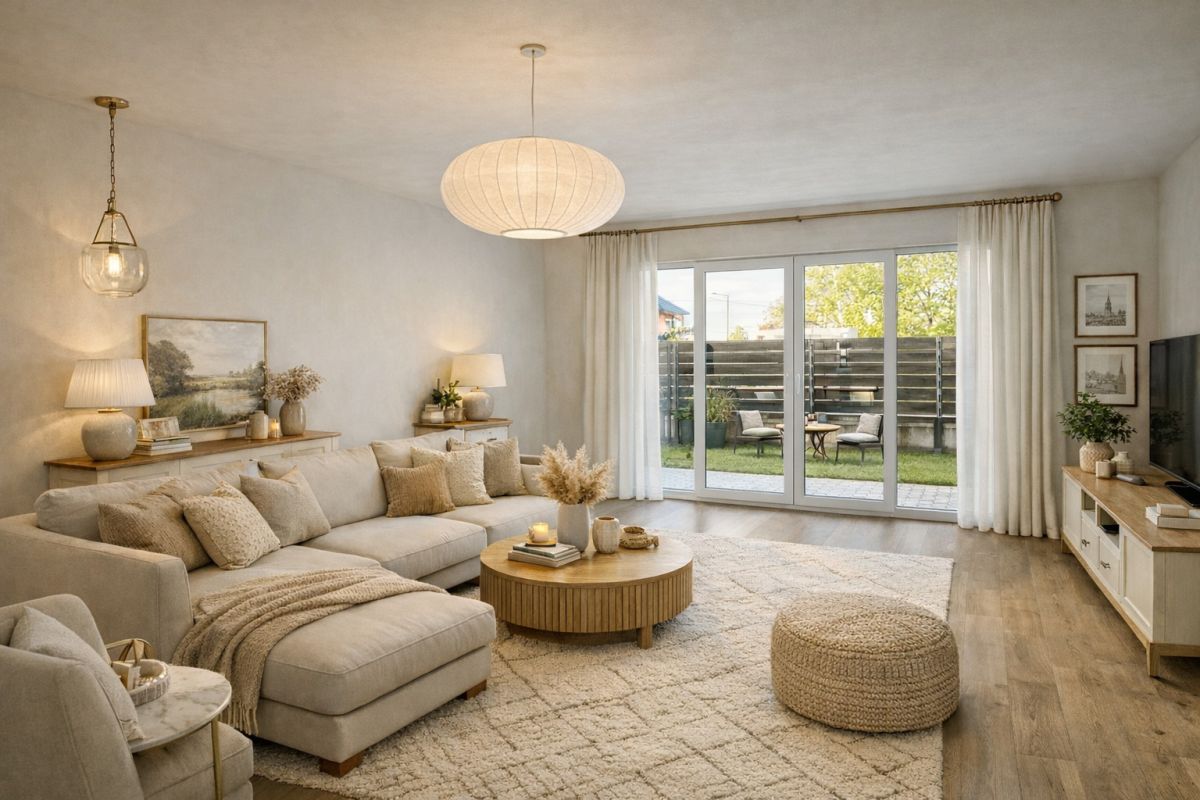 Z salonu bezpośrednie wyjście do prywatnego ogródka z tarasem, który stanowi naturalne przedłużenie strefy dziennej i świetne miejsce do wypoczynku.
