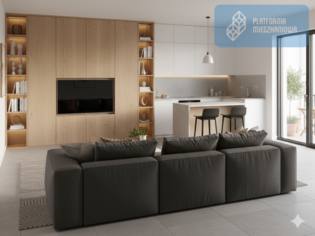 - Salon z aneksem kuchennym (16,65 m²): Jasna i ustawna strefa dzienna z bezpośrednim wyjściem na taras i przynależny ogródek.
