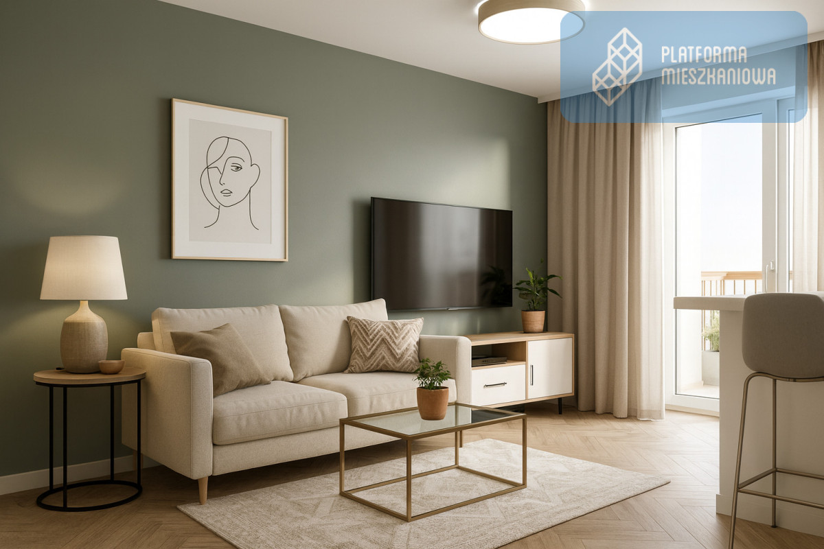- Salon z aneksem kuchennym - jasna, otwarta przestrzeń dzienna z wyjściem na balkon, idealny na poranną kawę lub odpoczynek po pracy.