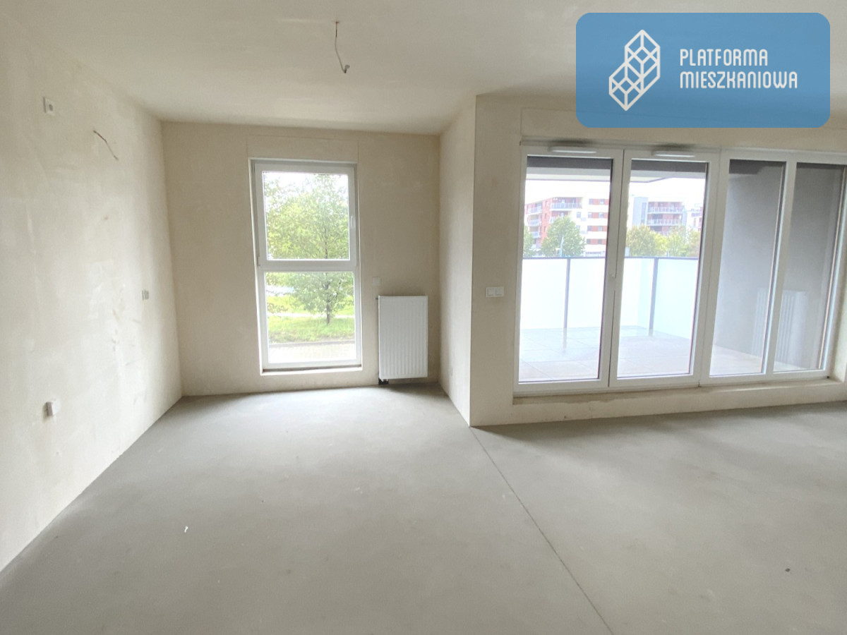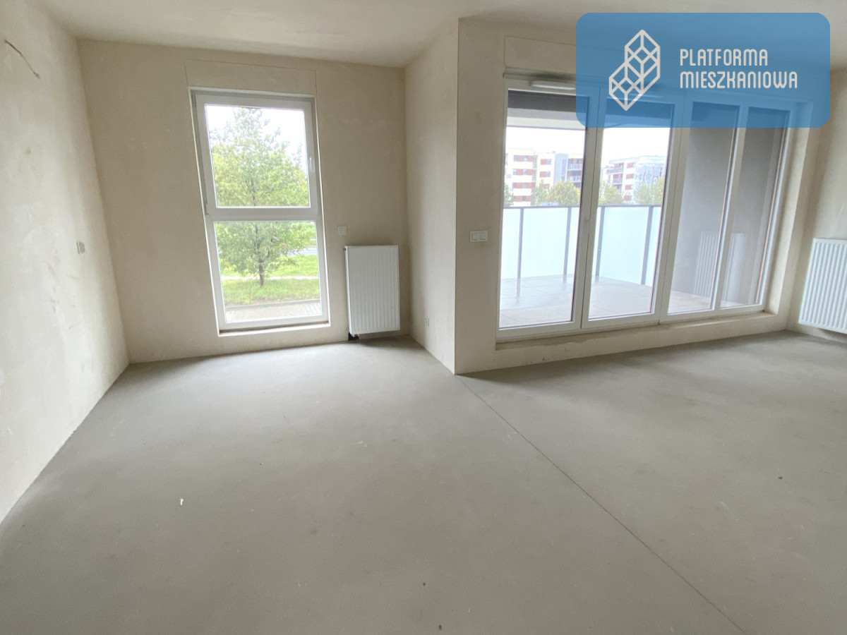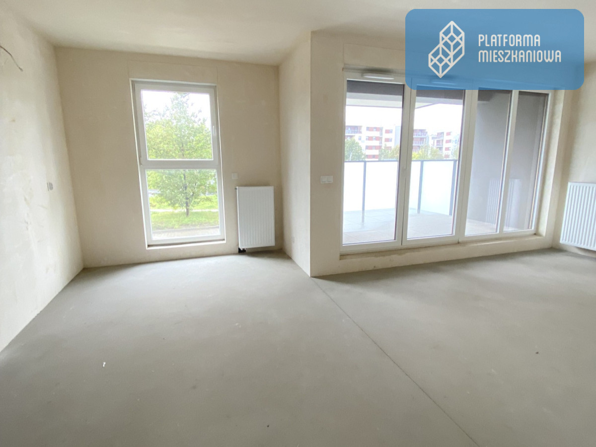 Już od progu widać światło wpadające przez duże przeszklenia i przestrzeń, którą możesz zaprojektować według własnych zasad. Zdjęcie oddaje realny klimat - jasne wnętrze, szerokie wyjście na loggię, zieleń za oknem. Tu naprawdę oddycha się spokojniej.