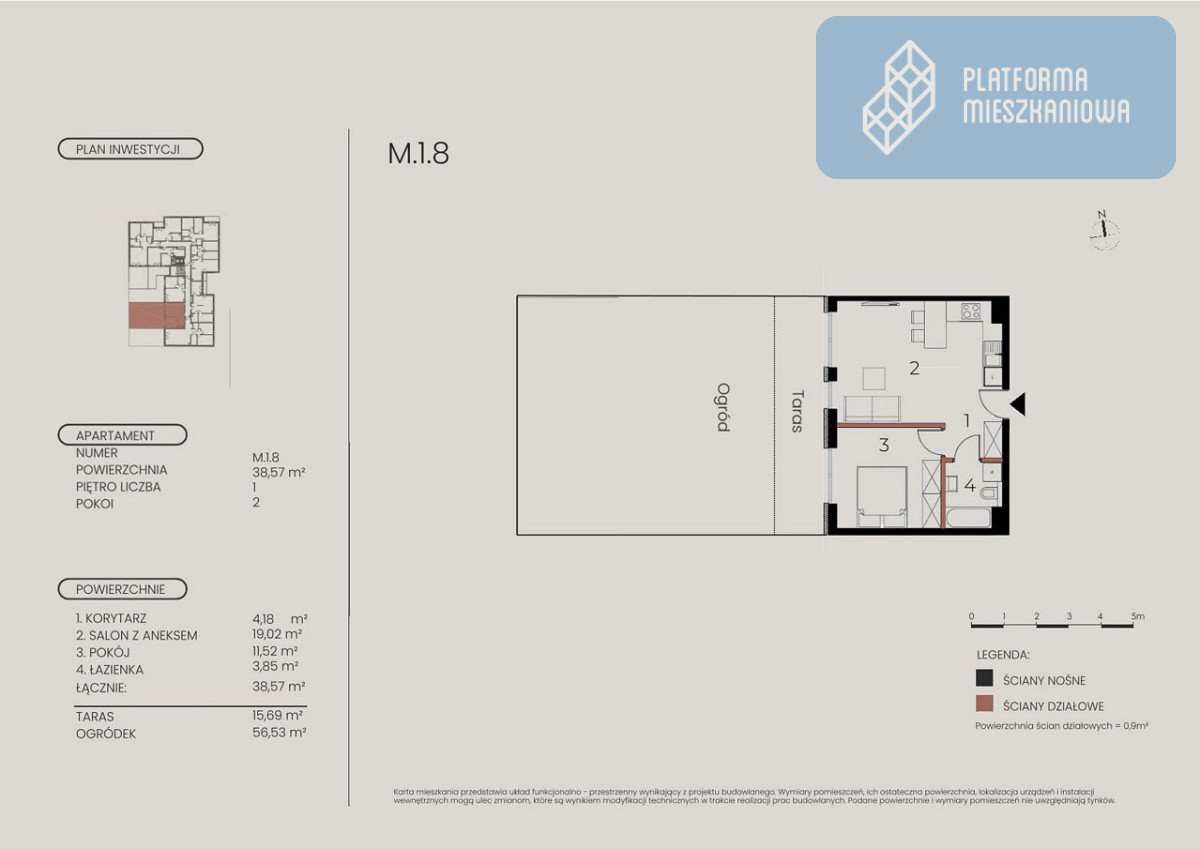 - Taras (15,69 m²) i Ogródek (56,53 m²): Gigantyczny atut mieszkania, idealny do relaksu, uprawy roślin czy spotkań ze znajomymi.