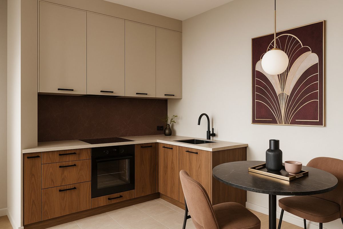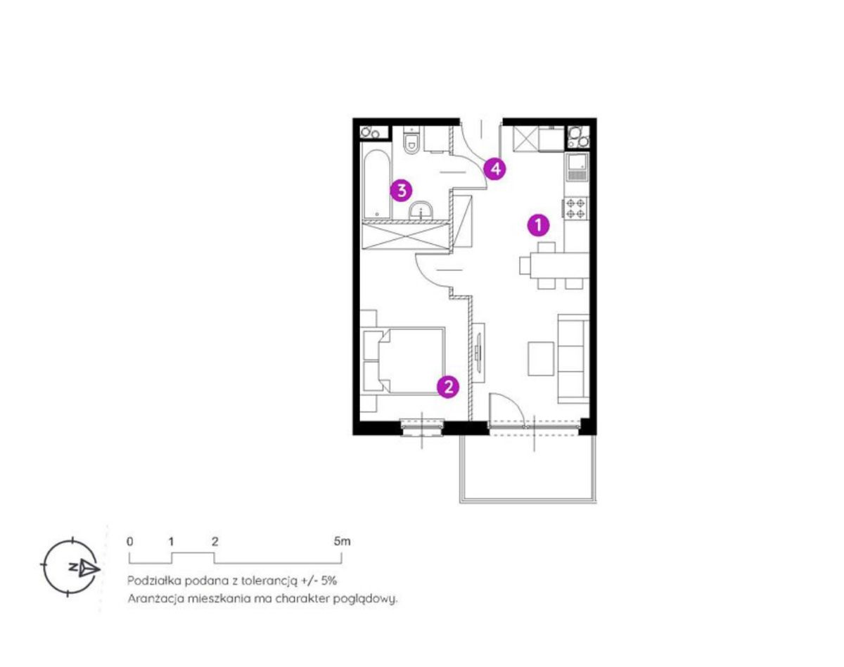 Strefa dzienna z aneksem kuchennym to komfortowe miejsce do wypoczynku i spotkań, z wyraźnie wydzieloną częścią kuchenną. Sypialnia zapewnia prywatność i przestrzeń na pełnowymiarowe łóżko oraz szafę. Przemyślany układ pomieszczeń pozwala również na wygospodarowanie dodatkowych miejsc do przechowywania - zarówno w sypialni, jak i w przedpokoju.