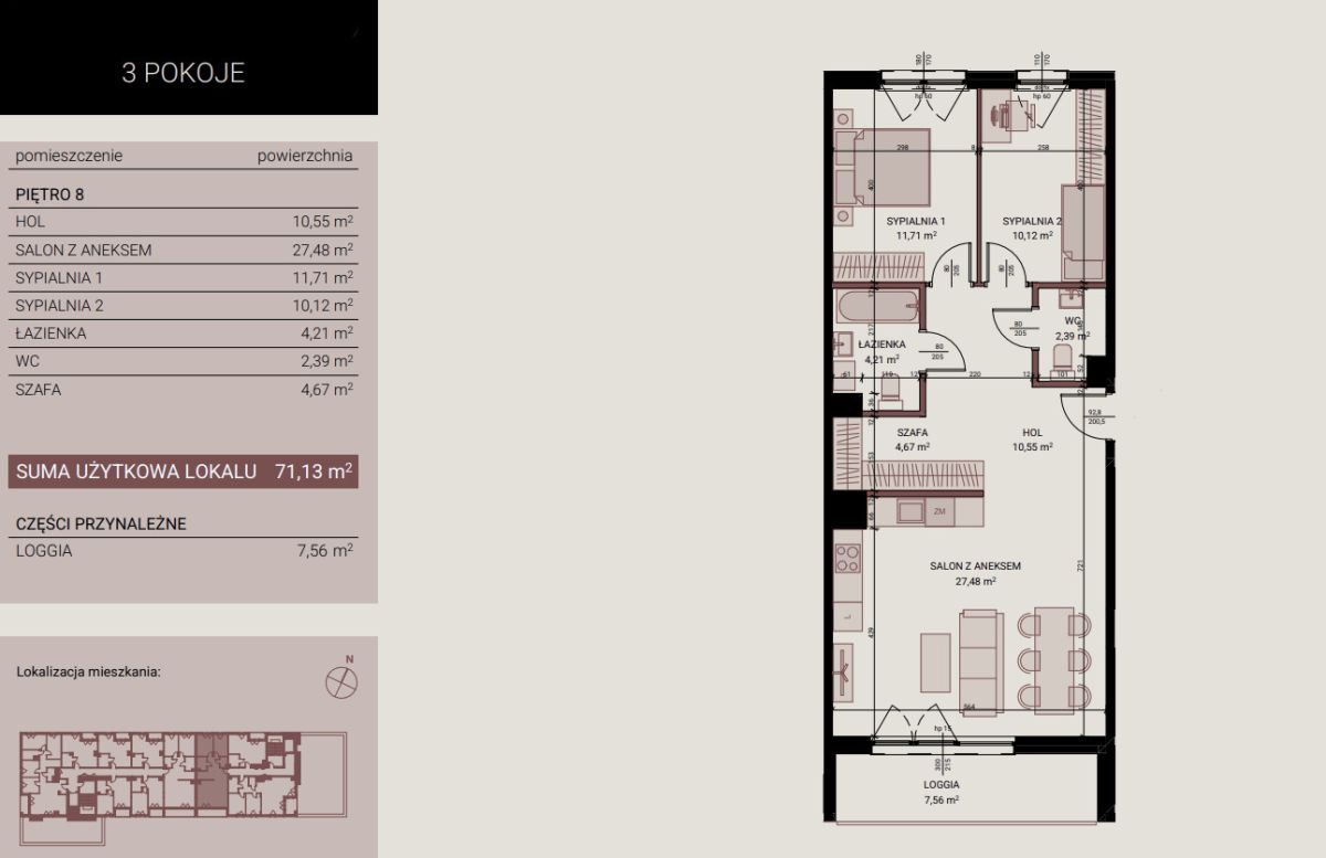 Sercem mieszkania jest duży salon z aneksem kuchennym o powierzchni 27,48 m². To komfortowa przestrzeń dzienna z miejscem na część wypoczynkową oraz duży stół jadalniany. Z salonu prowadzi wyjście na loggię o powierzchni 7,56 m², która stanowi idealne miejsce do relaksu.
