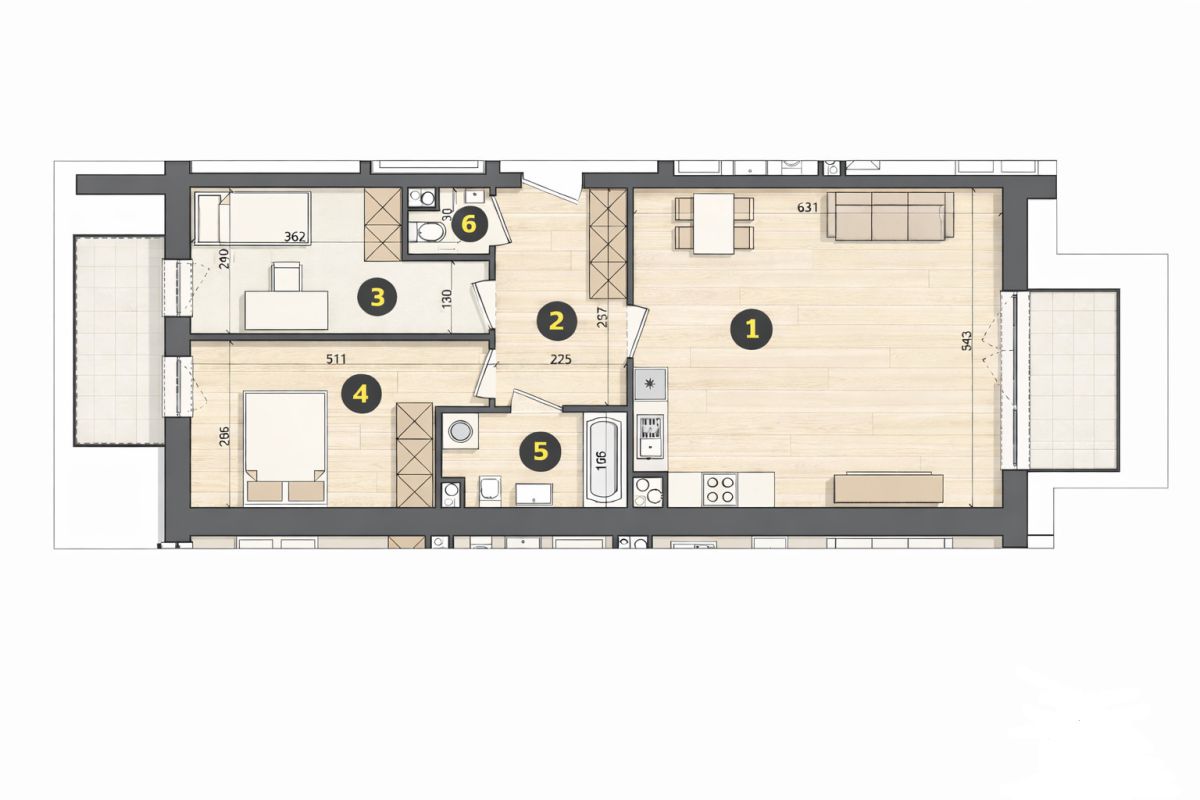 Mieszkanie zostało zaprojektowane w sposób, który realnie wspiera codzienne funkcjonowanie rodziny. Wyraźnie wydzielona strefa dzienna i prywatna dają domownikom komfort oraz poczucie porządku, a dobrze dobrane proporcje pomieszczeń pozwalają swobodnie urządzić wnętrza bez kompromisów.