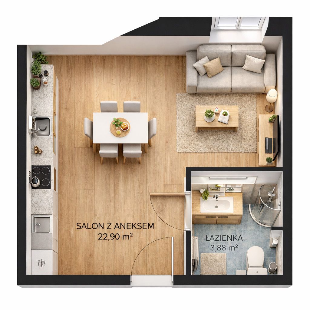 Wizualizacja przedstawia przykładową aranżację wnętrza. Informacja ma charakter orientacyjny i nie stanowi oferty w rozumieniu art. 66 §1 Kodeksu cywilnego.