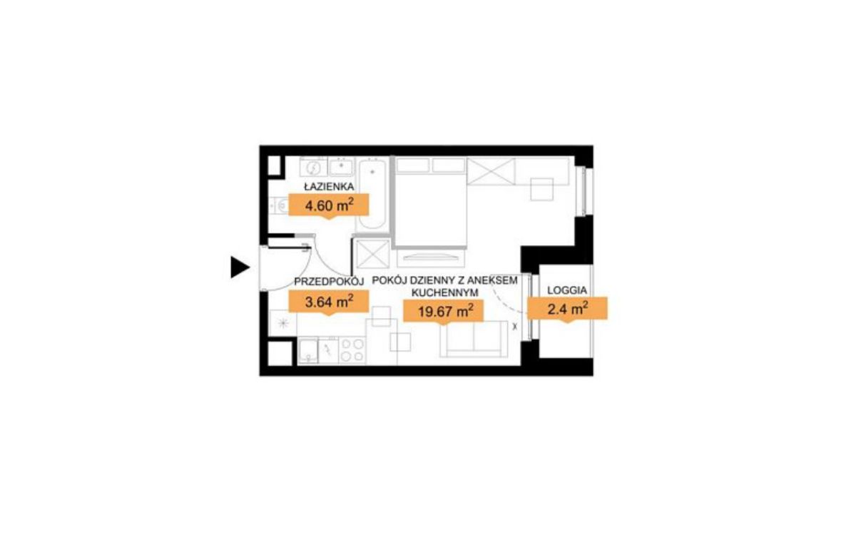 To mieszkanie wyróżnia się na tle standardowych kawalerek przede wszystkim przemyślaną koncepcją funkcjonalną.