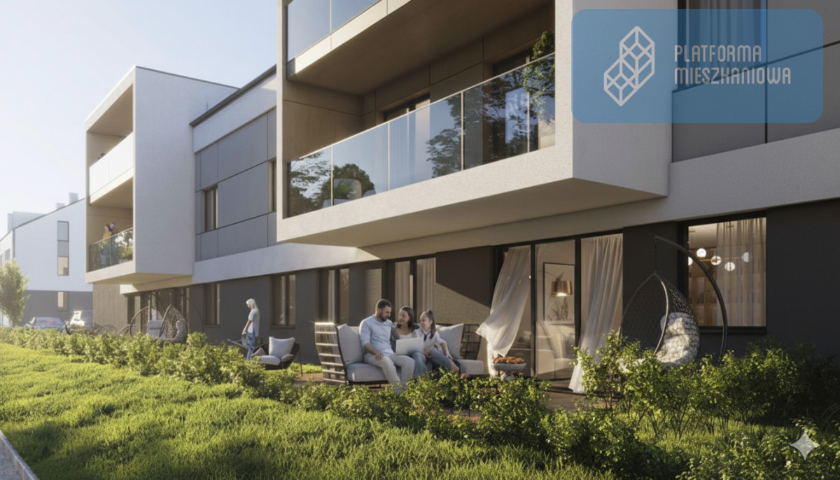 Zadbane tereny zielone wokół budynków tworzą przyjemną przestrzeń do relaksu i odpoczynku na świeżym powietrzu