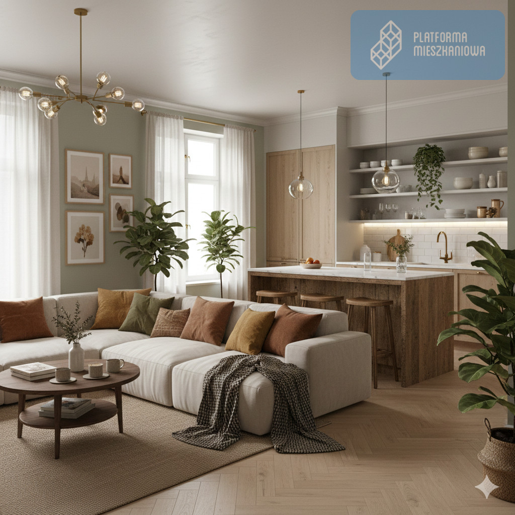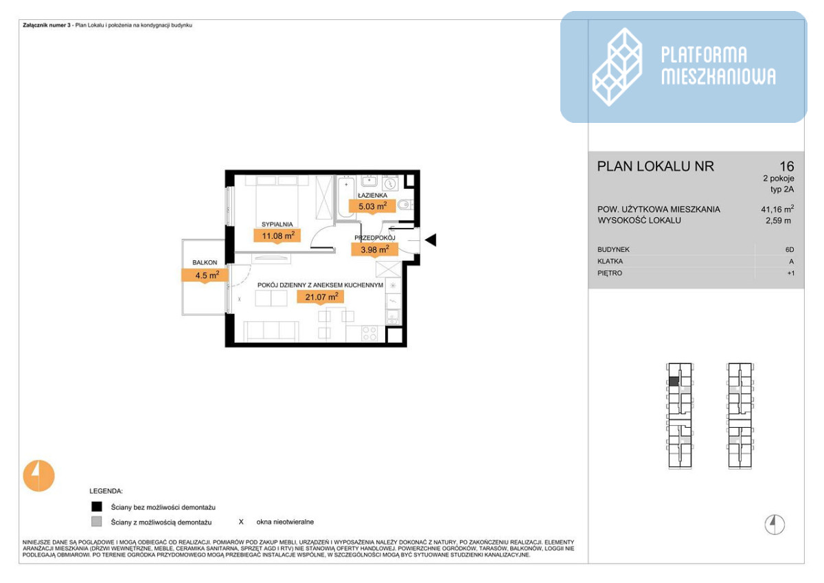 - Pokój dzienny z aneksem kuchennym: 21,07 m² - przestronna i słoneczna strefa dzienna.
