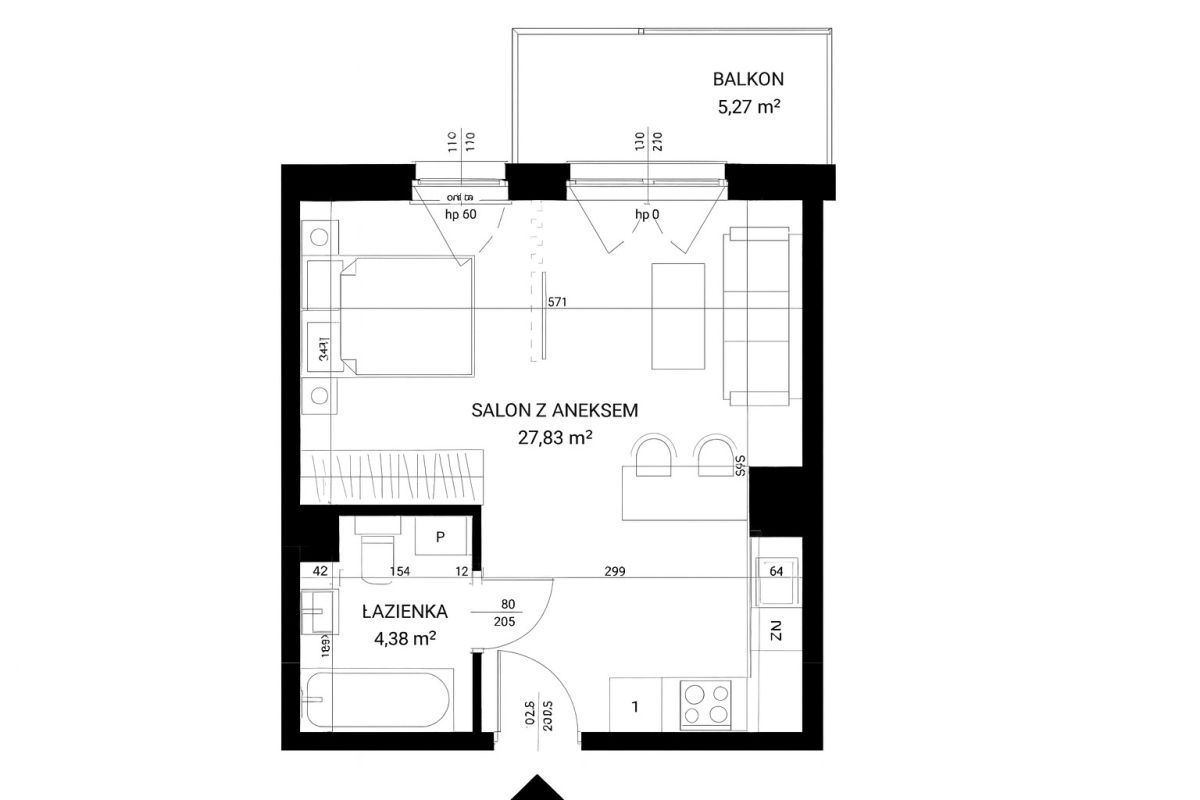 Ten apartament tworzy komfortową i wygodną przestrzeń do życia, ponieważ oferuje funkcjonalny układ - salon z aneksem oraz wyraźnie wydzieloną strefę sypialnianą.