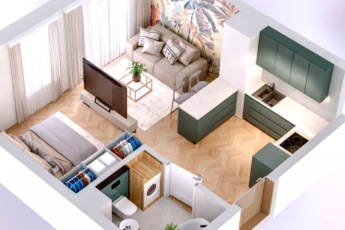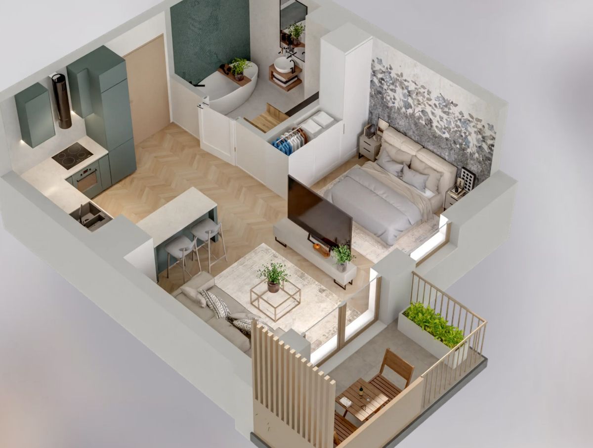 Mimo niewielkiej powierzchni mieszkanie ma wiele możliwości ciekawej aranżacji, np. oddzielenie sypialnie szklanymi, przesuwanymi drzwiami lub pozostawienie otwartej przestrzeni.