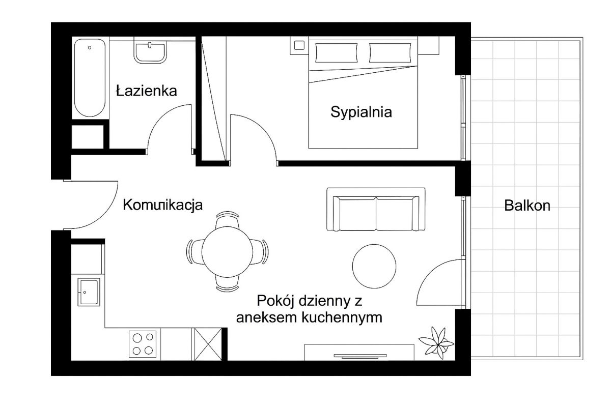 Wyraźnie zarysowana strefa dzienna pozwala cieszyć się przestronnością salonu, natomiast sypialnia jest intymna i ustawna, dzięki czemu łatwo stworzyć w niej komfortową oazę odpoczynku. Układ pomieszczeń daje swobodę aranżacji - niezależnie od stylu, wnętrze zachowa swoją elegancję i funkcjonalność.