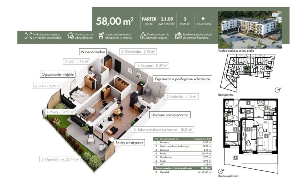 Mieszkanie wyróżnia się niezwykle funkcjonalnym projektem, który na powierzchni 58 m² mieści wszystkie udogodnienia dla rodziny. Lokal podłączony jest do ogrzewania miejskiego. Komfort i bezpieczeństwo zapewniają rolety elektryczne zamontowane w standardzie. Mieszkanie oddawane jest ze ścianami pomalowanymi na biało.