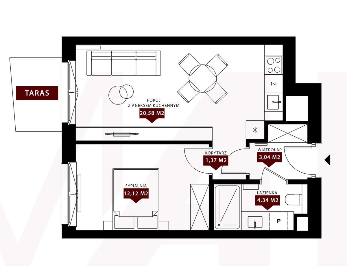 Mieszkanie składa się z przestronnego pokoju dziennego z aneksem kuchennym i wyjściem na taras, korytarza, sypialni oraz łazienki.