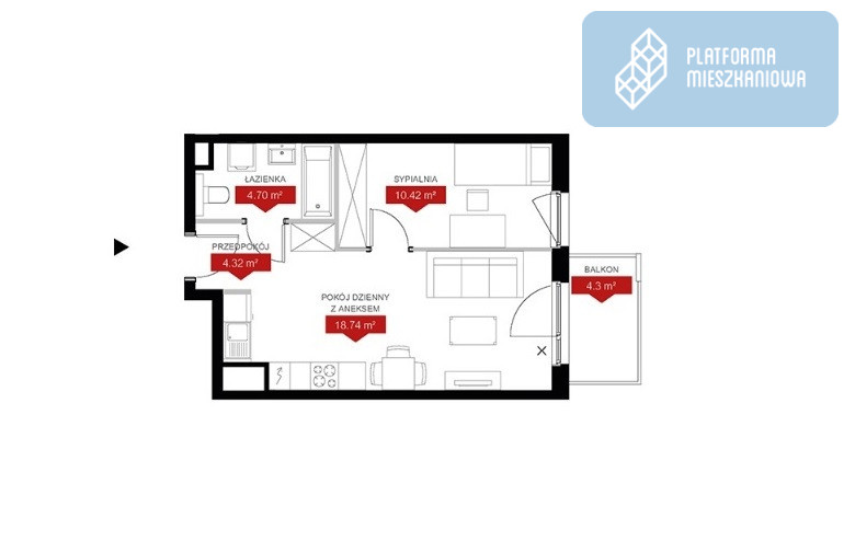 -pokój dzienny z aneksem kuchennym i wyjściem na duży balkon