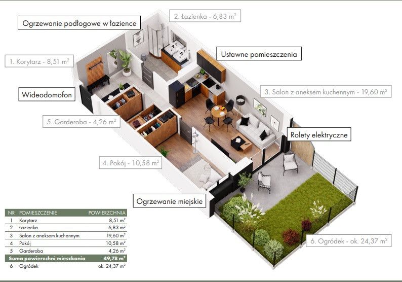 -każde mieszkanie wyposażone we własny taras lub przestronny ogródek