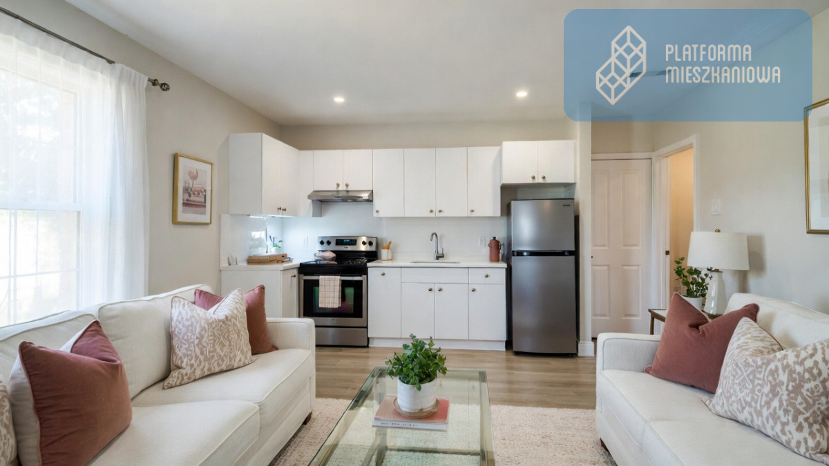 -przestronny pokój dzienny z aneksem kuchennym i wyjściem na duży balkon