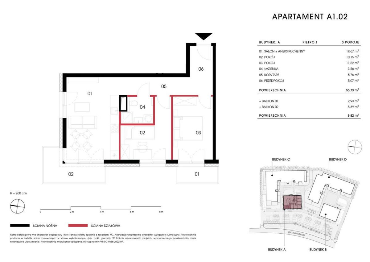 - salon z aneksem kuchennym 19,67 m2 z wyjściem na przestronny, narożny balkon 5,89 m2