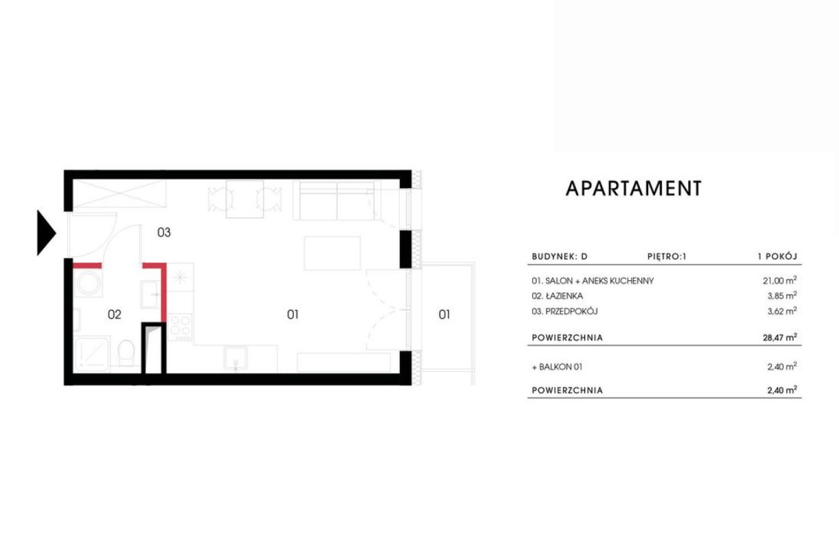 Funkcjonalna kawalerka o powierzchni 28,47 m², położona na 1. piętrze z balkonem 2,40 m², zlokalizowana na Naramowicach.