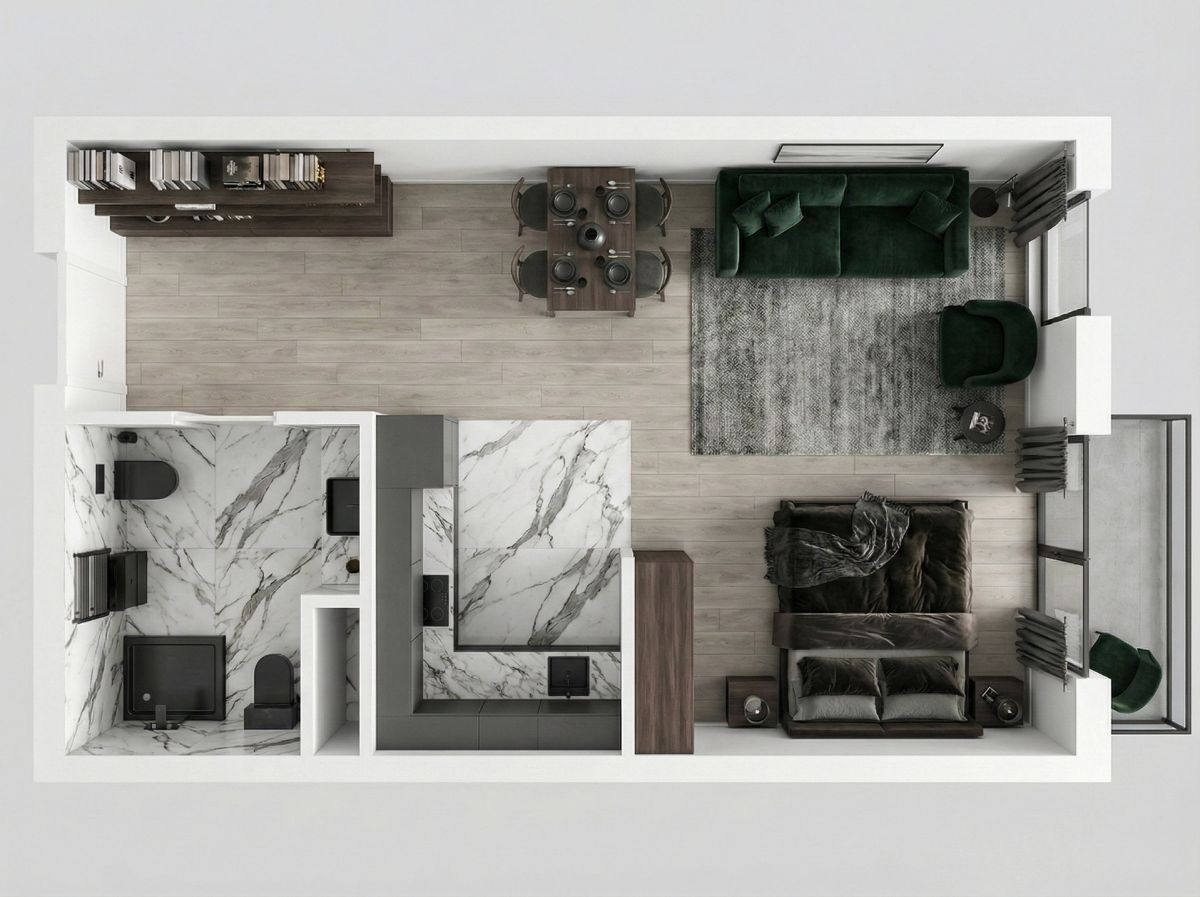 Układ mieszkania został zaprojektowany z myślą o maksymalnym wykorzystaniu przestrzeni — to idealna propozycja na start lub jako pewna inwestycja pod wynajem.