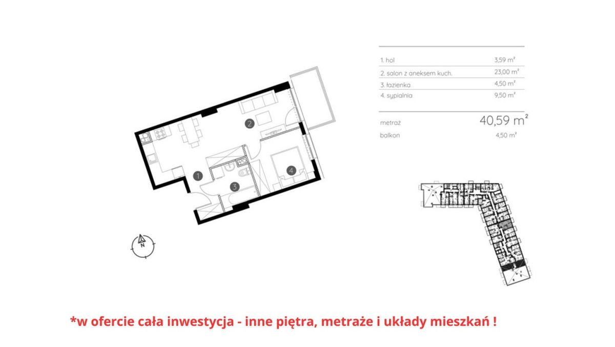 Oferowany lokal mieszkalny o pow. 40,59 m2 znajduje się na 6 piętrze budynku z szybkobieżną windą (dostępna inne piętra, układy, metraże) i składa się z następujących pomieszczeń: