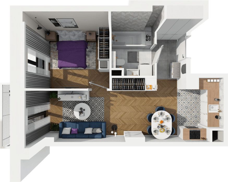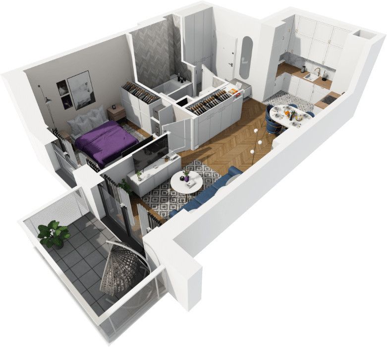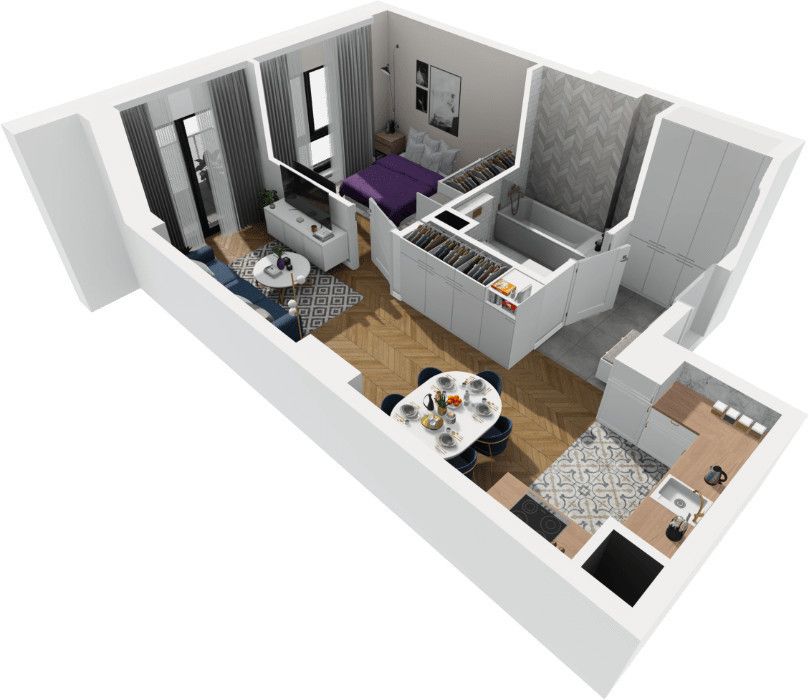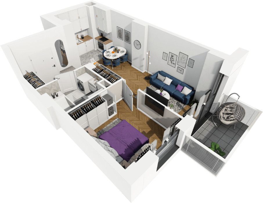 > przestronny aneks kuchenny z możliwością zabudowy kuchennej w literę U, co jest niespotykane przy niewielkich metrażach