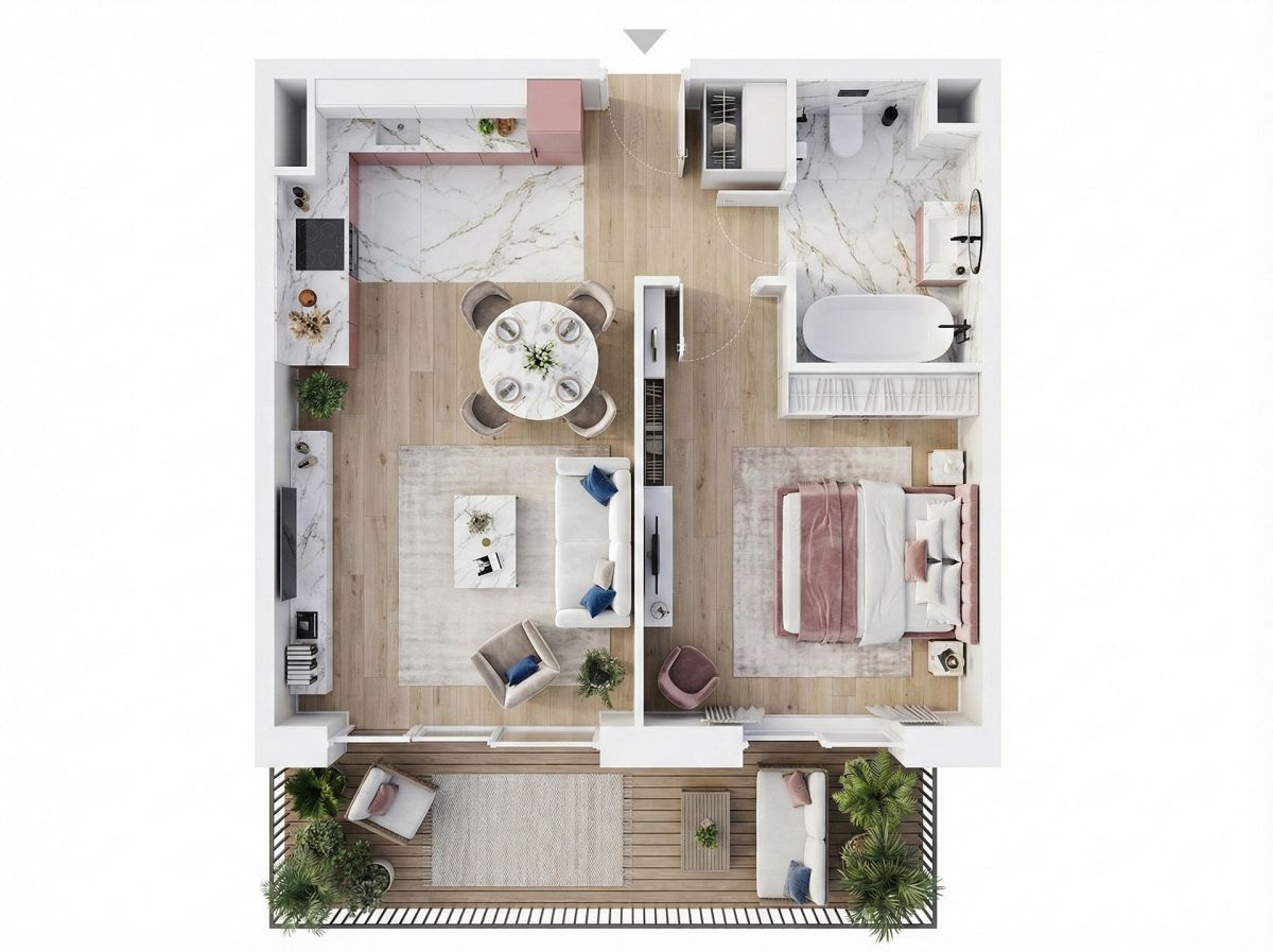 Mieszkanie wyróżnia się niezwykle funkcjonalnym projektem, który na powierzchni 37,85 m² mieści wszystkie udogodnienia dla pary lub singla.
