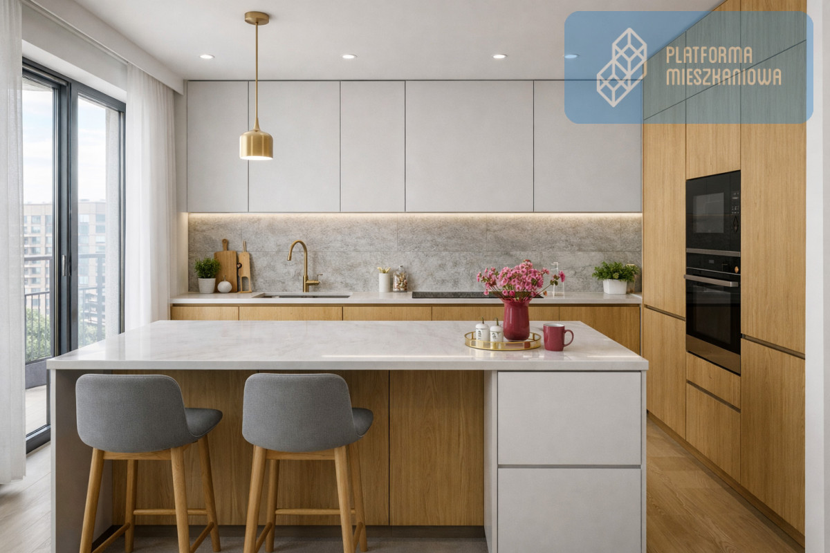 -przestronny pokój dzienny z aneksem kuchennym i wyjściem na balkon