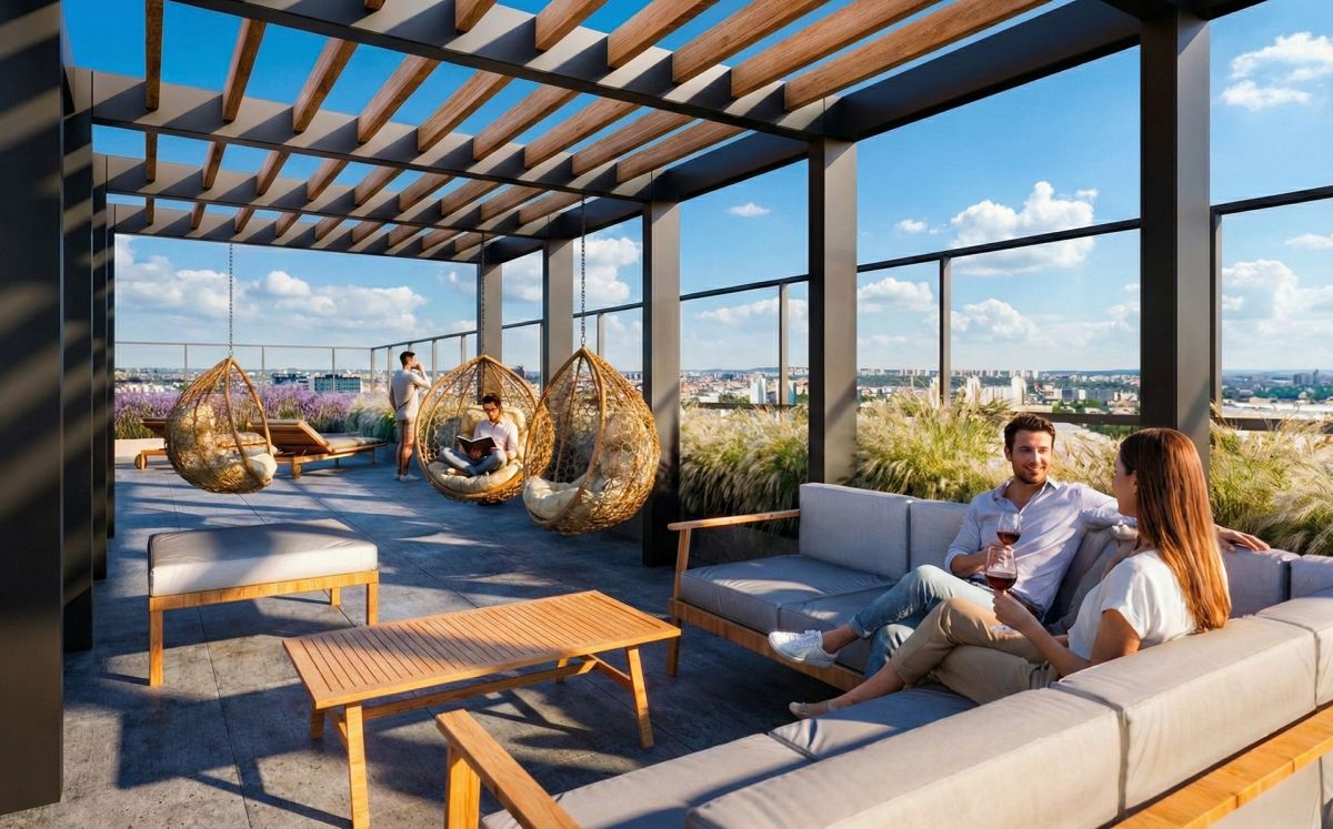 Mieszkanie wyróżnia się funkcjonalnym układem na powierzchni blisko 70 m2, oferującym przestrzeń i komfort dla rodziny, z dostępem do tarasu widokowego na dachu budynku.