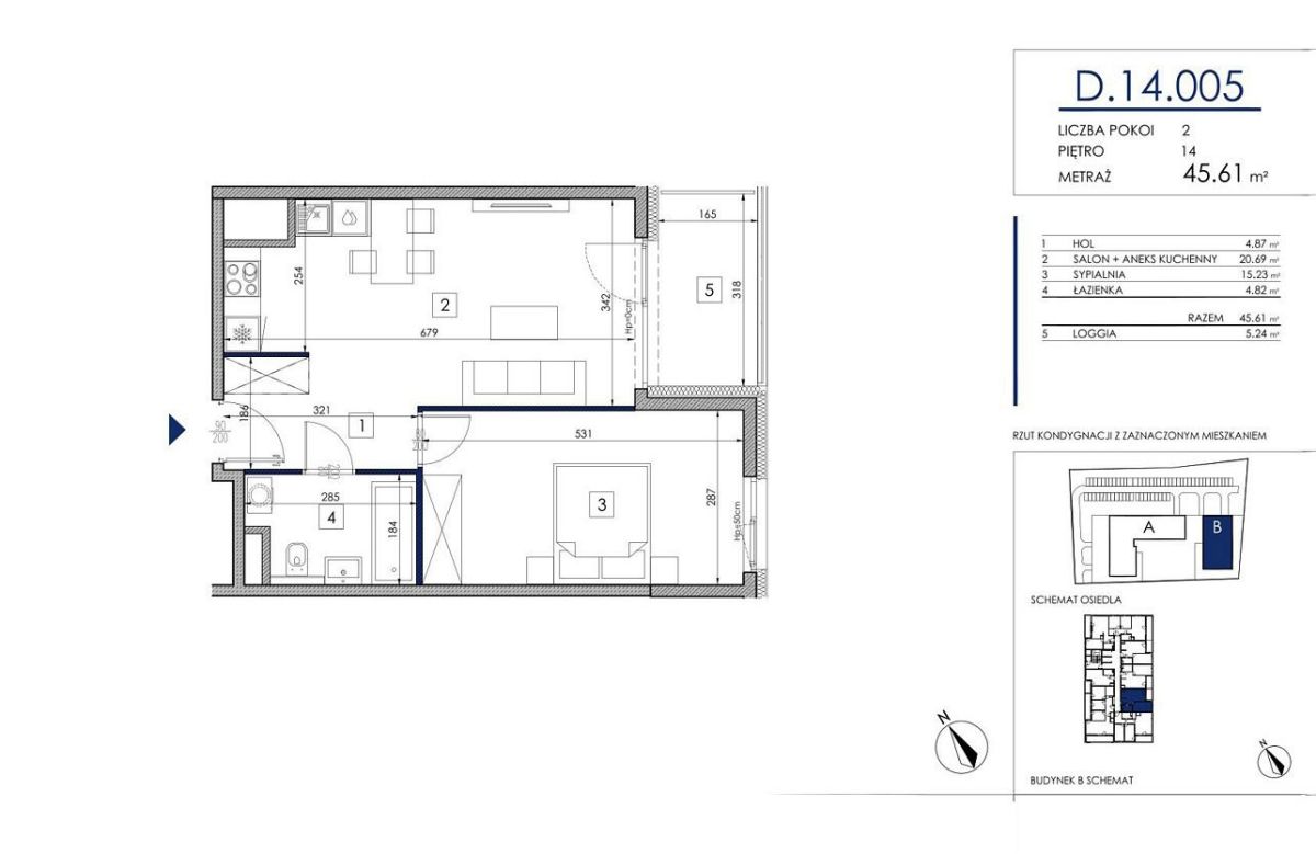 - Układ: Przestronny salon z aneksem kuchennym (20,69 m2), duża sypialnia (15,23 m2) oraz ustawna łazienka (4,82 m2)