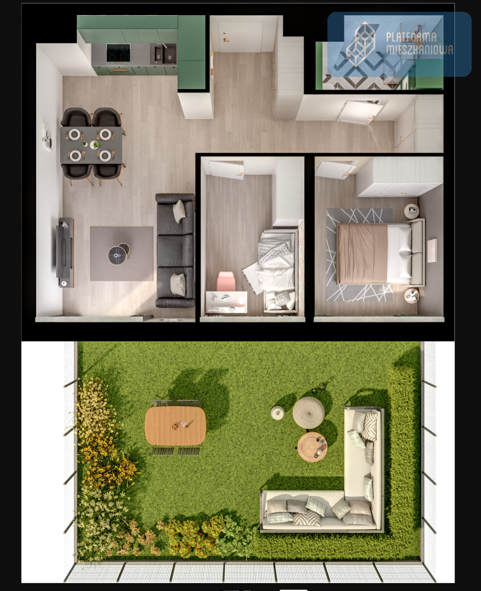 Wizualizacje w ofercie przedstawiają przykładowy sposób aranżacji wnętrza. Powyższa oferta ma charakter informacyjny i nie stanowi oferty handlowej w rozumieniu art. 66 1 Kodeksu Cywilnego.