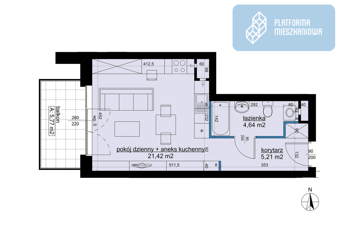 ◾️ salon z aneksem kuchennym ( 21,42 m2) z wyjściem na balkon (5.,77 m2)