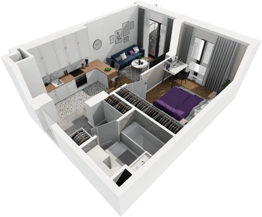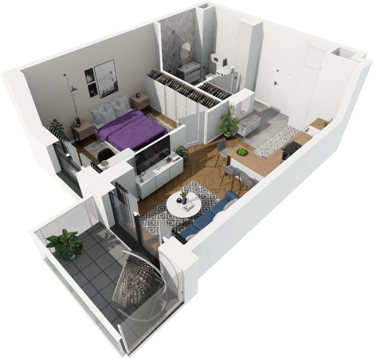 - przestronny salon z aneksem kuchennym 16,39 m2 z wyjściem na balkon 4,5 m2