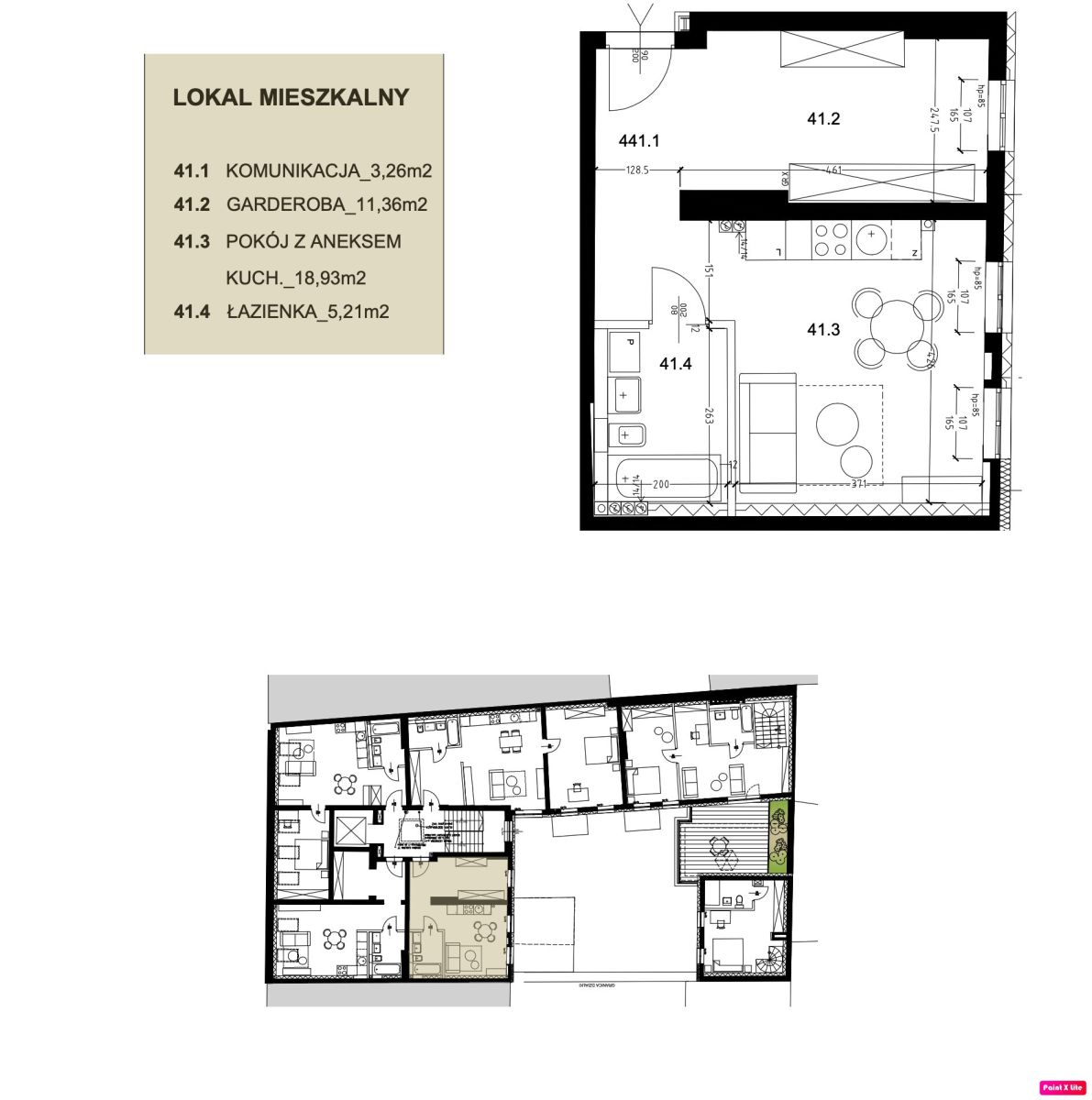 Mieszkanie składa się z przestronnego pokoju dziennego z aneksem kuchennym oraz:
