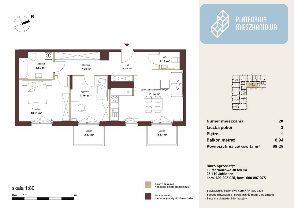 Dodatkowo dwa balkony (jeden z salonu, drugi z sypialni).