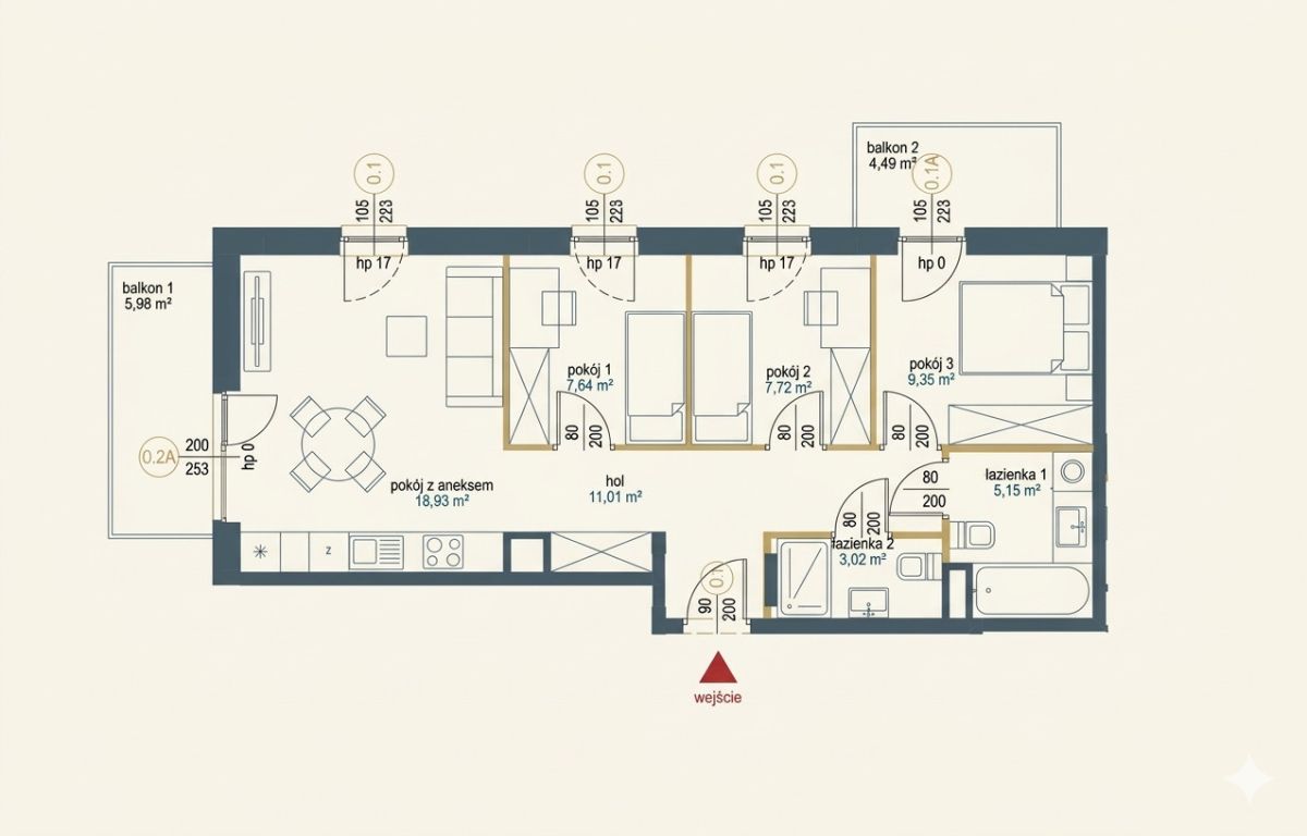 3 pokoje | 59.16 m² - przestronne wnętrze dla singla lub pary, idealne na start